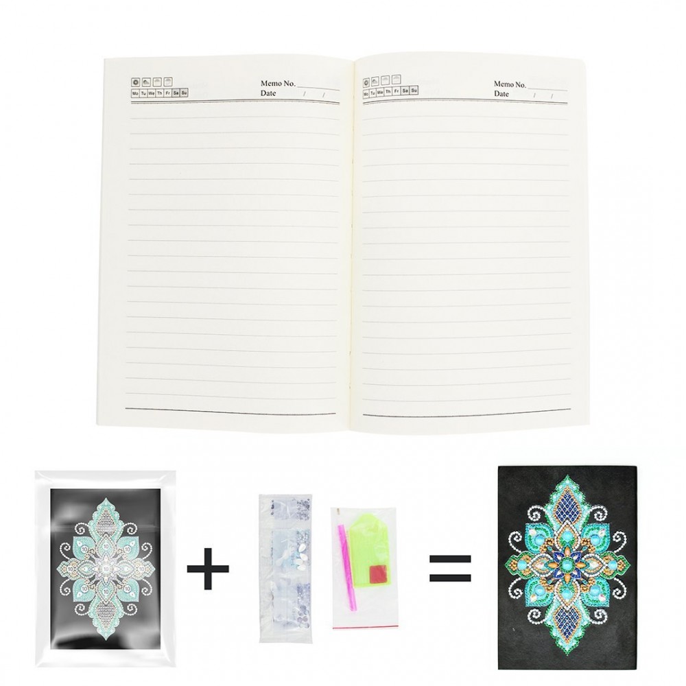 Dieses Notizbuch mit Linien hat ein schwarzes Hardcover mit einem Muster darauf. Auf diesem Cover können Sie mit den mitgelieferten Steinen ein schönes Diamantgemälde anfertigen und auf diese Weise ein sehr persönliches Notizbuch erstellen. Schön für sich selbst oder als Geschenk für jemand anderen.